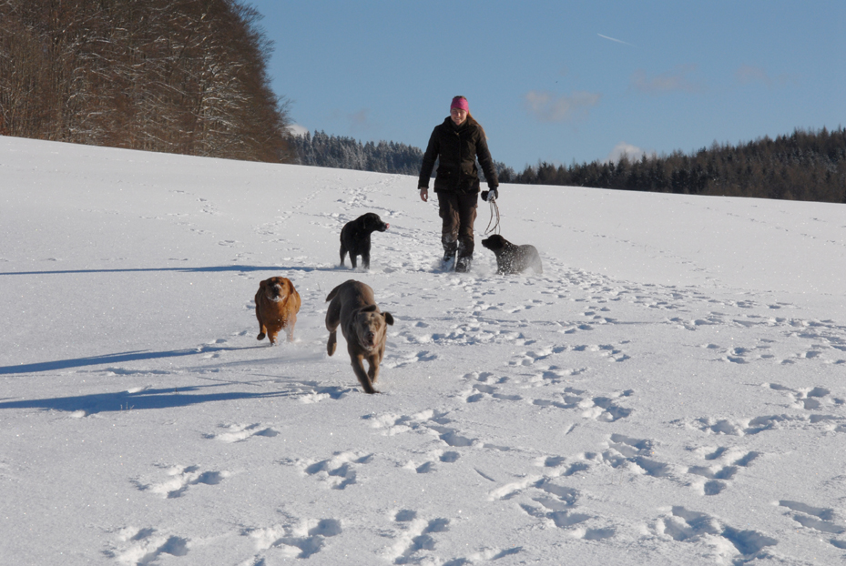 Hunde sind keine Stubenhocker. Deshalb unternehmen wir lange Spaziergänge, toben im Schnee, gehen baden, trainieren sie spielerisch und achten auf eine maximale Abwechslung im Umfeld und Ernährungsbereich.